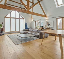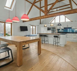 The first floor offers an impressive open-plan living space measuring approximately 60' x 18', enhanced by exposed A-frame king post beams dating back around 150 years. Natural light floods the space through solid oak Bereco double-opening windows and electric triple-glazed Velux roof lights with integrated rain sensors. Underfloor gas-powered wet heating runs throughout, and a full-width, full-height glass wall divider subtly separates the living area from the kitchen and family space while maintaining an open and airy feel.