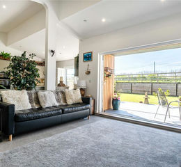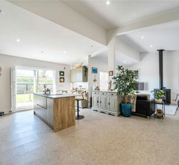 On first entering this property, there is a real sense of space and light with a fabulous and sizeable kitchen, dining, eating, and family area with a log burner. The kitchen incorporates a number of bespoke units, including a built in dishwasher, eye level double oven and five-ring induction hob with a large kitchen island. This kitchen exemplifies modern living, with French doors leading out from the kitchen area, and three bi-fold doors from the sitting area, directly into the garden. The entire property is immaculately presented with double-glazed tilt turn windows throughout with integral blinds and plantation shutters in the main sitting room. Many of the rooms have fantastic, vaulted ceilings and oak wooden doors. The property can safely be described as an eco-house; incredibly energy efficient with heating via an air source heat pump and underfloor heating throughout with heating thermostats in all rooms. To the side of the kitchen is a boiler room and separate utility cupboard with fittings for a washing machine.