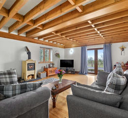 The accommodation is introduced via a welcoming reception hall, where a striking bespoke, handcrafted Romanian oak staircase forms a superb architectural centrepiece. To the right, a generous principal reception room provides an elegant yet comfortable living space, centred around a woodburning stove and complemented by double doors opening onto a raised patio terrace, perfectly positioned to take in the coastal outlook.