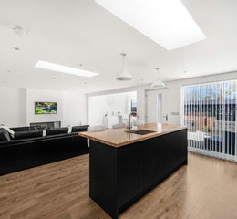 Lounge - Media wall with electric fireplace & T.V point, electric Velux window with rain sensor, solid wood flooring with underfloor heating, inset spotlights, power points, opening to.