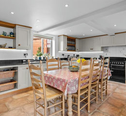 Breakfast Kitchen - 5.03m x 4.17m (16'6" x 13'8") - Approached via three short steps leading down to the main kitchen space which is fitted with a range of hand painted wall and base units, with solid granite working surface and upstands over, twin Belfast style sink unit with mixer tap, large electric range style oven by Aga, with induction hob and twin filter hoods over, concealed Bosch washing machine, concealed Bosch dishwasher, terracotta coloured tile floor, painted beams, downlighter points, double glazed window to front and double glazed French doors to rear. Part multi pane glazed stable style door to garden. Column style radiator. Door leading through to...