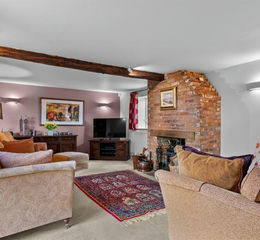L-Shaped Living Room - 6.27m x 4.09m expanding to 5.66m (20'7" x 13'5" ex - With feature exposed brickwork to fireplace with onset multi fuel burner and flagstone hearth, two timber framed double glazed windows to front elevation, further matching window to rear and French doors, beamed ceiling, wall light points.