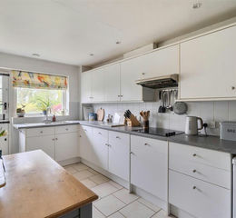 The kitchen is well-appointed to cater to all culinary needs, offering ample cabinetry and space for freestanding appliances, with a stable door opening onto the garden. Adjoining the kitchen is a useful utility room, with a cloakroom located to the rear.
