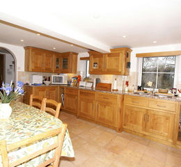 A farmhouse style dining kitchen with dual aspect double glazed windows; the front windows with superb far reaching views over the gardens to the wooded hills and open countryside that surround the property. The room has limestone tiles to the floor following through from the hallway. The kitchen is fitted with a good range of units in an oak finish with cupboards and drawers beneath a polished granite work surface with a tiled splashback, wall mounted storage cupboards with under cabinet lighting and glass fronted display cabinets. Set within the work surface is an under mounted twin bowl stainless sink with mixer tap and a Bosch ceramic hob over which is an extractor canopy. Sited within the kitchen is an eye-level electric double oven and grill and integral appliances include 12-place setting dishwasher and larder fridge. There is ample space for a family dining table and the room is illuminated by halogen down light spotlights. There is an electric night storage heater and a telephone point. From the kitchen a pine batten door with thumb latch opens to;
