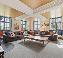 With dual-aspect windows with fitted modesty glazing. Suite with: shower cubicle with mixer shower, having overhead and handheld shower spray, and body jets; pedestal wash hand basin; and close-coupled WC. The room has built-in linen cupboards and a dual-fuel ladder-style towel radiator.