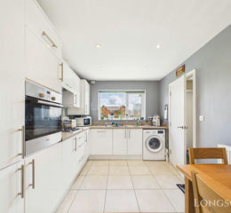 Fitted kitchen units to walls and floor, work surface over, stainless steel one and a half bowl sink unit with mixer tap and drainer, integrated electric oven, integrated Bosch hob with extractor hood over, integrated fridge/freezer, integrated Bosch dishwasher, space and plumbing for washing machine, tiles to floor, UPVC triple glazed window to front, radiator.