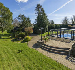 Foxenden Manor occupies an exceptional plot extending to approximately 5.65 acres of beautifully landscaped grounds. The outdoor space has been thoughtfully designed and meticulously maintained, featuring a well-kept tennis court and a striking glass-enclosed air-source heated swimming pool.
