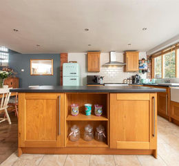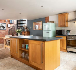 Kitchen Diner - 4.7 x 7.4 (15'5" x 24'3") - With double glazed window and door to front, central heating radiator and part wood, part tiled flooring. Featuring various fitted wall and base units with worksurface over and a matching island, Belfast sink and integrated dishwasher. There is space for a large oven and fridge freezer, along with further space for a dining table and chairs. The iron spiral staircase leads to the first floor landing and doors lead through to: