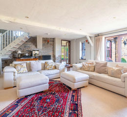 Large feature open inglenook fireplace with original wood beam and a wood burner stove on slate hearth. Features exposed pointed stone to the breast and surround. Two Victorian type roll top radiators. Hardwood double doors leading out to front forecourt with double glazed panel windows to either side and a further double glazed window. Down-lighting throughout the room and part feature exposed stone walls. Original beam to ceiling.