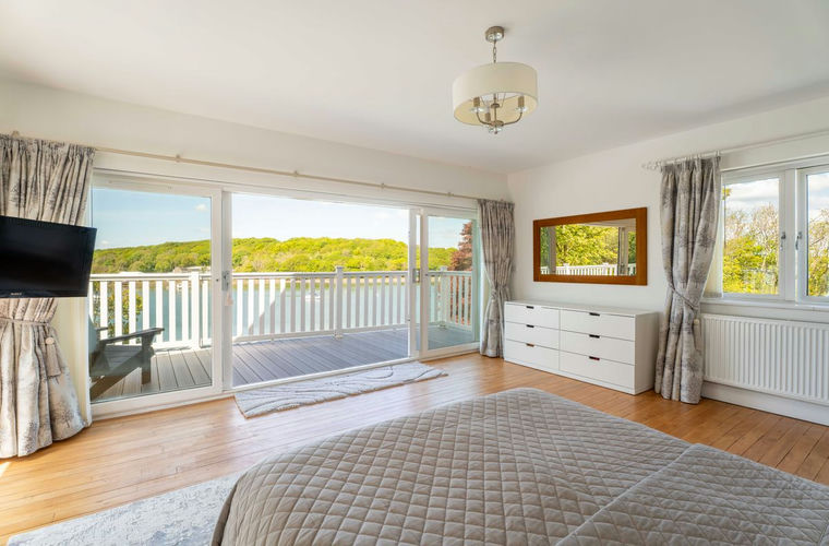 Laid to lawn with mature borders, views over the water.; With seated patio entertaining area, lawn and woodland to the rear; Leading out from the principle bedroom, this wrap around balcony offers splendid views over the water.