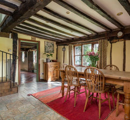 Oak Tree Cottage has seen many changes over the years, not least two becoming one and pantiles replacing thatch; though its immense character remains, and recent works have been carried out with the utmost respect for this special home, using lime-based render (spot the boxing hares) and local hazel and horsehair within restored lath and plaster. Beautiful beams and timbers stay exposed in every room, and few homes have so many gorgeous, rustic doors. The wonderful inglenook fireplace now has a cosy log burner that throws heat around the home, but thrillingly, its old bread oven, too.