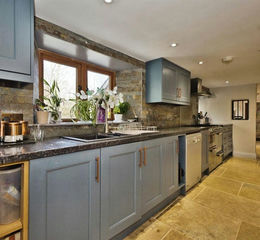 Galley-Style Kitchen. Stone Slab Flooring. Various Wall and Base Units with Work top Over. Range-Style Cooker. Space and Plumbing for Dishwasher. Space for Fridge Freezer. Radiator. One and a Half Sink Unit with Drainer and Mixer Tap Over.