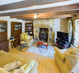 Wooden floor, two radiators, window to front, granite inglenook fireplace to one wall with fuel burner, beamed ceiling, door from both the living room and dining room lead into the: