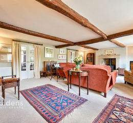 Large reception room with exposed beams, and a multi- fuel stove in a stone surround.