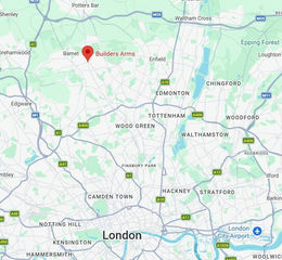 The Builders Arms is located on the western side of Albert Road, close to the junction with the A110 East Barnet Road. The pub is only a couple of minutes' walk from New Barnet railway station, which provides frequent Great Northern services into central London (including routes towards Moorgate and King's Cross). The immediate area has seen significant development including the Victoria Quarter, a scheme of over 400 residential units on the former gas works site, immediately opposite the Builders Arms.