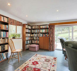 Spacious room with windows front and rear, wood burning stove set on stone hearth, range of bespoke fitted bookshelves forming the library area, patio doors opening to a large flagstone patio.