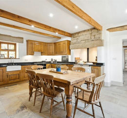 17’11” x 15’11” With substantial oak entrance door. Sealed unit double glazing providing fine long-distance views over woodland to the countryside beyond with oak window seat. Oak staircase leading to the first-floor landing. Feature stone fireplace and hearth. Understairs storage. Stone flagged floor with zoned underfloor heating. Exposed beams.