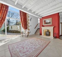The entrance hallway with mezzanine landing sets the tone with immediate impact. Double-height glazing draws in natural light, illuminating sand-toned Italian tiles and the texture of exposed stone. French doors open onto the garden beyond, creating a seamless connection between inside and out, while a log burner anchors the space with warmth.