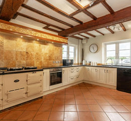 The expansive kitchen is a culinary enthusiast’s dream, boasting elegant granite countertops, shaker-style cupboards and ample space for a large dining table, embodying the essence of a quintessential country kitchen. This space also features a premium electric AGA stove, a built-in fridge freezer and charming stone flooring, seamlessly blending modern functionality with timeless charm.