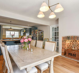 However, the hub of this house is clearly the fabulous kitchen/dining room which runs the depth of the property, with windows overlooking both the front garden and doors to the rear garden. The kitchen area has underfloor heating and features wooden hand built cabinetry by John Lewis of Hungerford, fitted appliances including a Rangemaster range style cooker, with under pelmet lighting and wooden worksurfaces. There is a beautifully designed breakfast bar with deep overhang for bar stools. The dining area has ample room for a large farmhouse table, and features a charming original brick built chimney with inset lighting. From the kitchen, a door leads through to the recently added laundry/boot room, which benefits from underfloor heating under a stone floor, and doors to both the front and rear of the property.