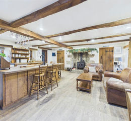 Feature galleried entrance area opening into a dining hall with stone flagged floor and feature staircase leading to a galleried landing. Double doors open into the sitting room with a feature stone fireplace and multi-fuel fire. A large open-plan living kitchen, bespoke in oak, incorporates an adjacent dining and family area, with a further heavy stone fireplace housing a multi-fuel stove and oak flooring throughout. Additional ground floor accommodation includes a cloakroom, walk-in pantry, and boot room with stone flagged flooring and access to the rear terrace and garden.