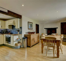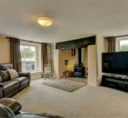 An entrance porch opens into a welcoming reception hall, from which a staircase rises to the first floor. The principal sitting room is of generous proportions and centres around a large inglenook fireplace with wood-burning stove, creating a natural focal point while enjoying far-reaching views across the surrounding land. To the other side of the hall lies an L-shaped kitchen/dining room, also featuring a wood-burning stove and forming the heart of the home.