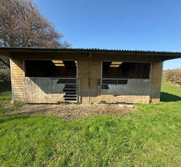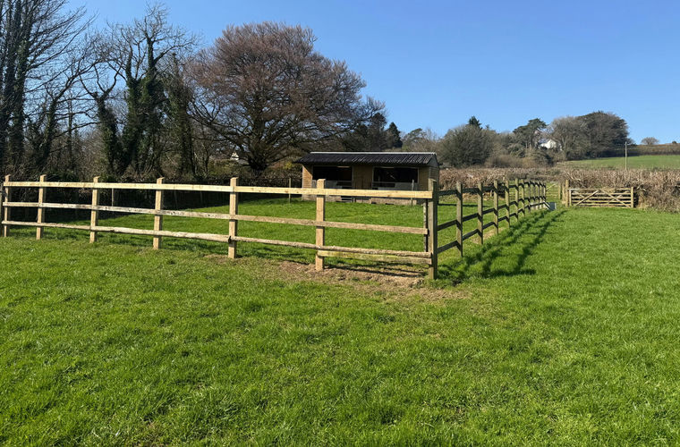 Surrounding the field shelter is a small paddock area enclosed by timber post and rail fencing. The area has a hardcore base, which continues from the entrance gateway around the entire enclosed paddock.