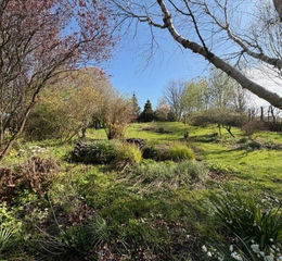 Beyond the front garden is a small field/additional garden plot, laid to lawn with a garden pond.