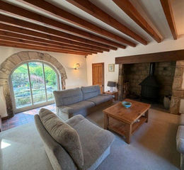 A large family lounge with feature arched barn, double glazed, window. Wonderful garden views. Additional double glazed rear window. Feature fireplace housing a stylish Norwegian stove. Exposed ceiling beams. Part quarry tiled flooring.