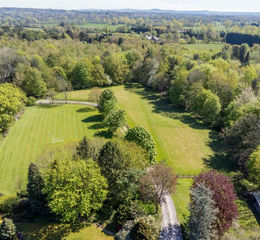 Approached via a sweeping private driveway, the property is framed by open paddocks and mature woodland, immediately establishing a sense of arrival and seclusion.