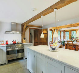 The accommodation is thoughtfully arranged to suit a variety of lifestyles. A ground floor en suite bedroom provides flexibility for guests, multigenerational living, or those wishing to future-proof their home. The remaining three bedrooms are located upstairs, alongside an impressive main bathroom with a freestanding Victorian-style tub and a walk-in double shower. The principal reception rooms balance elegance with warmth: a substantial sitting room with oak beams, a wood-burning stove, and a bay window looking onto the gardens; and the heart of the home, an enviable kitchen with space for lounging and dining in the wonderful sun room with vaulted ceilings. Here, a classic grey shaker kitchen is complemented by a Britannia range oven, while the dining area is filled with natural light and enjoys views over the garden. Practical touches include underfloor heating, a utility room with direct access to the garden, perfect for dogs and muddy boots, and a ground floor cloakroom.