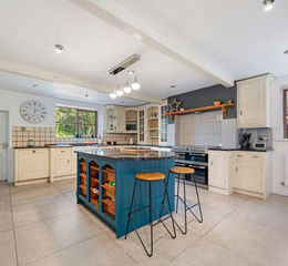 The accommodation briefly comprises of a welcoming entrance hallway and large arched window enhanced by stone lintels which leads into the reception area which features tiled floors and a stone fire surround. The accommodation flows into a separate dining room and through into the impressive lounge, extending to over 29' complete with vaulted ceiling, impressive A frame beams, the staircase rising to the first floor via a minstrel gallery, and further two feature arched windows one with access in to the gardens. Moving to the other side of the property the further reception rooms include an additional and cosy living room set around a contemporary fire and with French doors leading on to the patio area and the lovely farmhouse style kitchen including space for a range cooker and central island. There is a further dining area (this room could equally be used as a home office) and a handy laundry room and off lying cloak room completing the ground floor. The first floor offers four very good-sized bedrooms. The master bedroom enjoys a stunning vaulted ceiling and a walk- in wardrobe with a smart modern shower room complete with double shower and vanity unit. The three further bedrooms are all good doubles and are serviced by a family bathroom comprising of a freestanding bath, separate shower, wall hung wash hand basin and w.c. Neutral tiling completes the room.