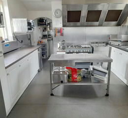 13' 4" x 12'5" A versatile and well equipped commercial kitchen with tiled floor. Units incorporating recently installed LPG cooker, 3 bowl sink, stainless steel worksurfaces, fridges, freezers, microwaves, deep fat fryers, equipment etc.