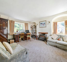 Stone steps lead to the front entrance, where a sturdy wooden door opens into a welcoming reception hallway. A striking wooden parquet floor is complemented by panelled walls and a convenient cloaks area. From here, a staircase leads to the first-floor accommodation, while doors open to the sitting room, ground floor shower room, and through to the lounge. The sitting room offers versatility, currently serving as a home office. Character features include a stone fireplace and exposed ceiling beams, while triple-aspect windows flood the space with natural light, creating an airy and inviting reception room. A well-appointed ground floor shower room is accessed from the hallway, comprising a shower cubicle, storage units incorporating a vanity wash hand basin, a WC, a ladder-style radiator, and a window to the side aspect.