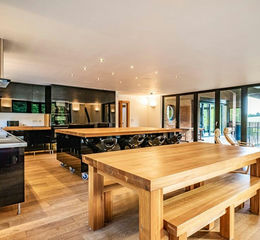 Careful planning and attention have provided modern open plan living alongside grand classical living and ambience, embracing the delightful gardens and grounds and far-reaching views, with inside-outside living encouraged via covered and uncovered elevated decked areas, brought into the house by multiple sets of sliding folding doors.