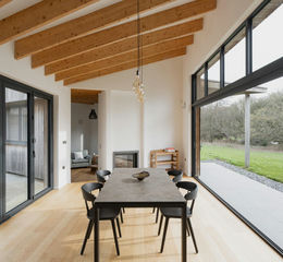 Pivot House's primary entrance is on the westerly front and is flanked by the kitchen to its south and ancillary boot room, WC and study to the north. Beyond is an inner arterial corridor skirting the central courtyard and linking the rest of the house. A spacious dining space sits at one end of the kitchen, and links to the main reception room that sits at a slightly lower level.