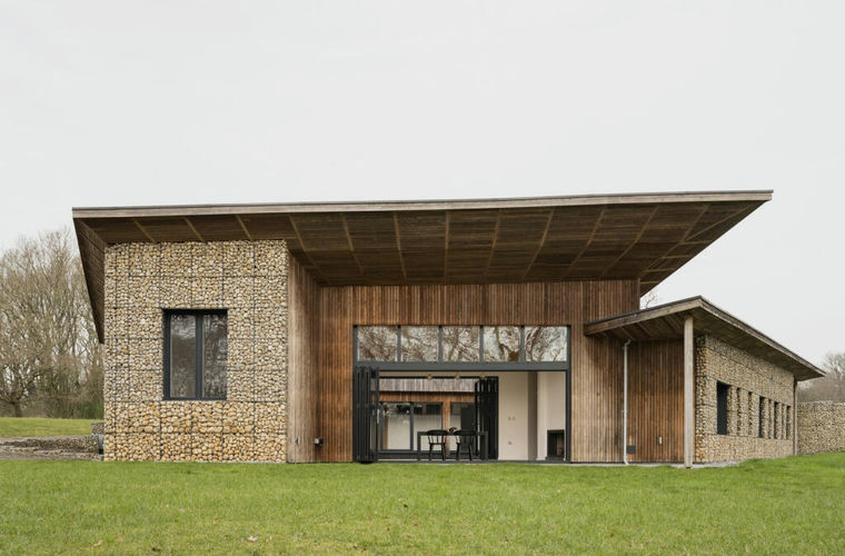 Lowered into the landscape, Pivot House is well and truly rooted into its natural setting. Taking inspiration from the random nature of tree growth, the building's profile is dominated by flint-filled gabions and greying oak cladding, which rises with a series of wave-like monopitched sedum roofs. From here, a parabolic umbrella of beams flies from a central interconnecting glazed courtyard spine, with a series of rooms encircling it.
