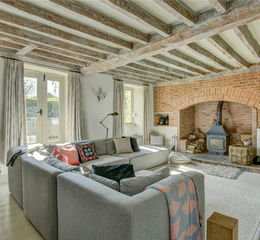 Reception space is plentiful, including a sitting room/playroom with a wood burning stove and built in cupboards and shelving. A music room, also with fireplace and wood burning stove, is found along the long hallway together with a study and a further large sitting room with French doors onto the front patio and a large inglenook fireplace with wood burning stove. The kitchen is beautifully fitted with a range of hand painted wall and floor mounted cupboards including a large island with new quartz top and four ring induction hob and a four oven electric AGA. There is also a newly installed secondary kitchen, with modern electric oven and space for additional fridge and wine cooler. The kitchen flows into the dining area which in turn leads through to the oak and glazed garden room with French doors to the large rear terrace. This room enjoys magnificent views over the pond, the garden and the shepherds hut beyond.