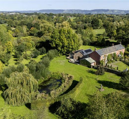 A traditional gate leads in to Rendy Farm and opens out to extensive gravelled parking with attractive driveway lighting. A mature, high Hornbeam hedge with an arch leads in to the front of the house with deep paved terrace and lawned gardens, with large mixed borders, a beautiful stone wall behind and a pretty octagonal gazebo. A substantial pergola covered with roses, clematis and grapevine leads to steps up to the kitchen garden with hedging, raised beds containing flowers for cutting and an established asparagus bed. An elegant wooden framed greenhouse is set at the end of the path and neighbours further flower beds and a cage of raspberries and blueberries. The remainder of the garden includes generous expanses of lawn, some hedging, mature and ornamental trees and an orchard which compiles a variety of apples, pears and plum trees. A natural pond lies near the small stream which runs along the lower part of the garden, crossed by 2 arched wooden bridges and lined by small willow trees. The far south western corner of the gardens sees a traditional shepherds hut, having electricity and water supply.