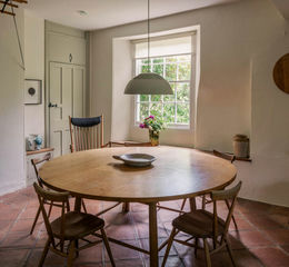 The substantial dual-aspect kitchen and breakfast room revolves around a large Aga set within the chimney breast, complete with a laundry drying rack above. Traditional farmhouse units house the appliances and are topped by solid oak work surfaces sourced from Jays' own woodland, blending charm and functionality. Terracotta tiles and simple walls provide a refined, soothing backdrop. A romantic window seat in the dining area frames breathtaking views across the surrounding gardens.