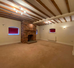 Generous sitting room with stunning feature brick fireplace with wooden mantel and slate hearth and beamed ceiling, wooden windows, two modern flat panelled radiators.