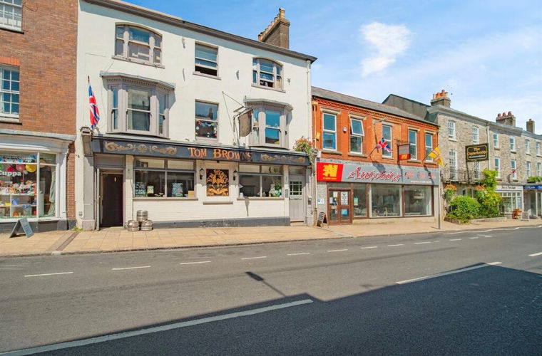 The property comprises two adjoining mid-terrace buildings known as Tom Browns and Autobitz, located in a prominent position in central Dorchester. Tom Browns is a well-established public house arranged over ground and first floors, featuring a function room on the upper level and a spacious beer garden to the rear. Above the licensed trade areas are two self-contained residential flats, arranged over the first and second floors. Adjacent to this, Autobitz is a commercial premises (Use Class E) comprising a large open-plan retail showroom on the ground floor, upper-level storage, and a rare and substantial rear barn currently used for additional storage purposes.