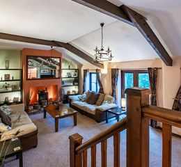 Living Room - 7.10m x 4.22m (23'3" x 13'10") - A lovely characterful room with exposed ceiling beams with sloping roof lines. Feature fireplace with flagged hearth, two radiators, wall lights, double glazed window overlooking the rear garden and double glazed french doors opening onto the garden. Internal arrow slit window.