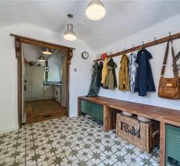 Upon entering March Barn through the front door, you are welcomed by a large, spacious boot room. This bright and airy space features a generously sized window that allows natural light to flood in, along with a practical tiled floor. One wall is fitted with built-in bench seating, offering ample space for boots and shoes, with coat hooks conveniently placed above.