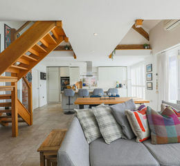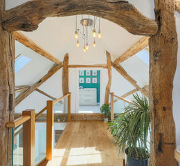 Known as The Gallery, the property takes its name from the striking oak and glass galleried landing, a centrepiece that epitomises the fusion of traditional and modern design. Originally dating back to the 19th century, the barn has been transformed into a stylish family home, showcasing character details such as exposed beams and preserved historic graffiti, while offering bright open-plan living and the comforts of modern finishes.