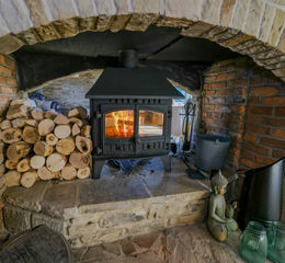 Lounge/Dining Room - 9.65m x 5.69m (31'8" x 18'8") - An amazing room with huge amounts of flexible space, double height, open to the eaves with exposed beams and roof trusses and a central stone chimney breast with a double fronted solid fuel stove. The dining area has a corner bar with hatch through to the kitchen and sliding front aspect windows with beautiful views. The lounge area has both rear and tall front aspect windows looking over the gorgeous landscape.
