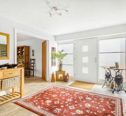 The recently replaced partly glazed composite door with side panels leads into a spacious hallway with an oak staircase to the first floor and useful storage underneath. Double doors lead into the living room and kitchen.