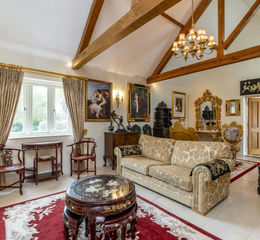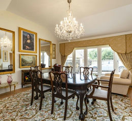 This lovely, spacious dining room, with its vaulted ceiling and floor-to-ceiling windows looking out to the front of the property, is accessed via the drawing room.