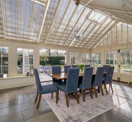 Orangery - Bespoke solid wood construction, with limestone floor, 2 pairs of French doors open to the garden terrace and pair of bi-fold