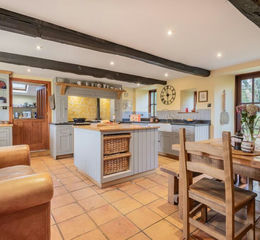 The kitchen lies at the heart of the house, anchored by a traditional Aga and framed by time-softened beams overhead. It is a space that invites long, unhurried mornings and evenings shared around the table, with the warmth of the range lingering in the air. Beyond, a spacious and practical utility room adds discreet functionality, providing an additional external access point for muddy boots or walks returning from the fields. Nearby, a cloakroom and generous storage spaces ensure that the beauty of the home never compromises on practicality.